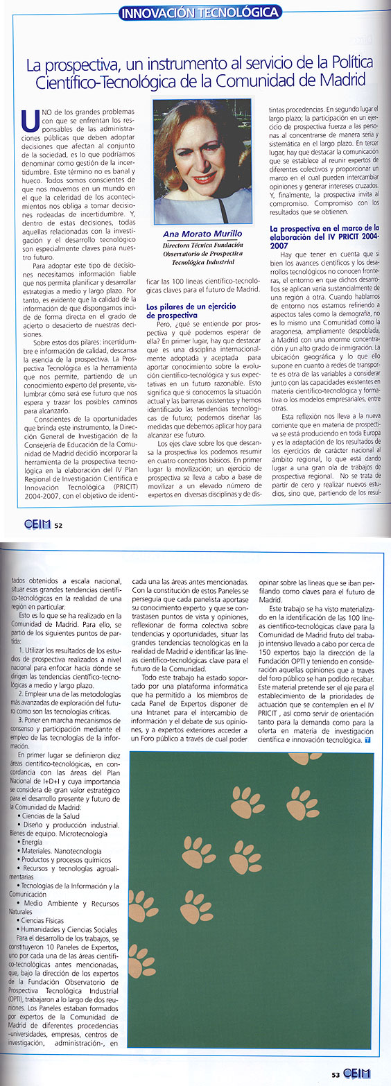 La Prospectiva Tecnológica es la herramienta que nos permite, partiendo de un conocimiento experto del presente, vislumbrar cómo será el futuro que nos espera y trazar los posibles caminos para alcanzarlo. La Dirección General de Investigación de la Consejería de Educación de la Comunidad de Madrid decidió incorporar la prospectiva tecnológica en la elaboración del IV PRICIT, 2004-2007.