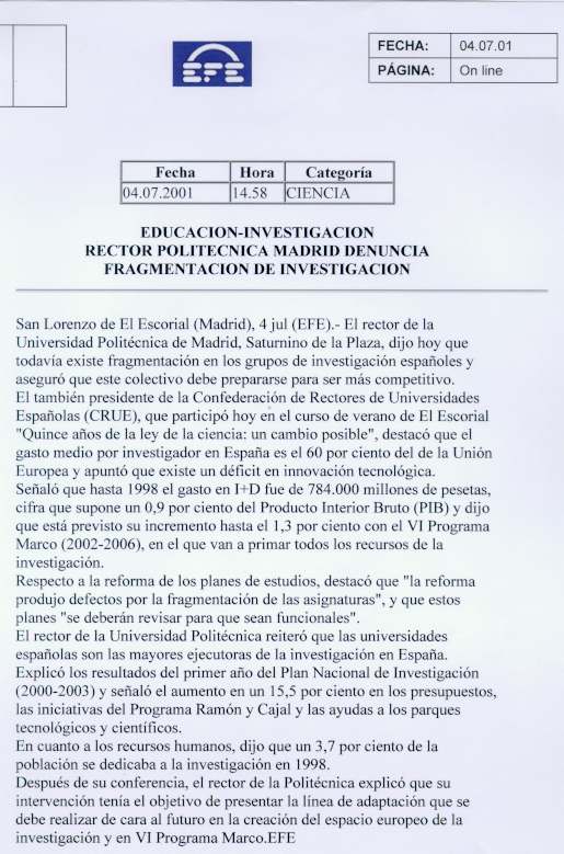 El rector de la Universidad Politécnica de Madrid, Saturnino de la Plaza, dijo hoy que todavía existe fragmentación en los grupos de investigación españoles ...
