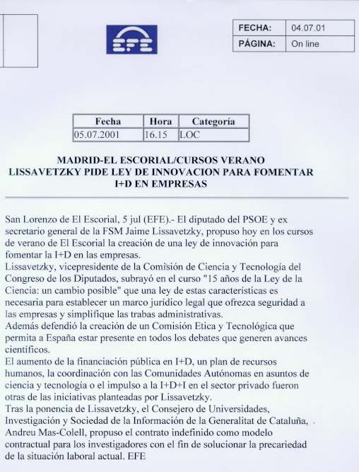 El diputado del PSOE y ex secretario general de la FSM Jaime Lissavetzky, propuso hoy en los cursos de verano de El Escorial la creación de una Ley de Innovación para fomentar I+D en las empresas.