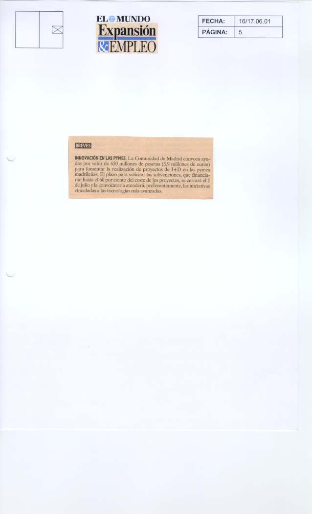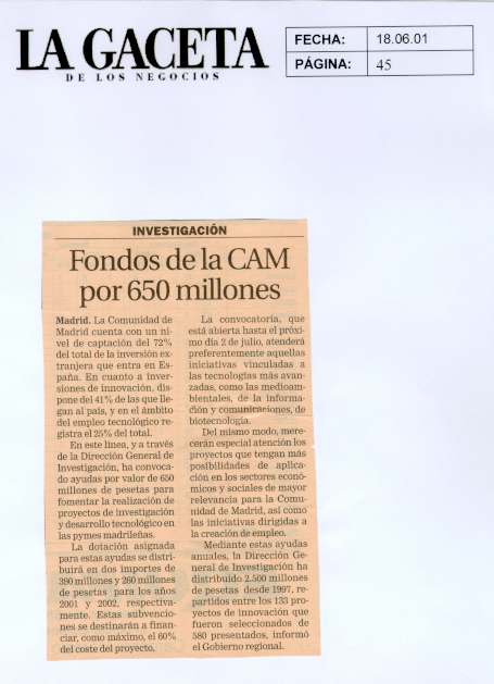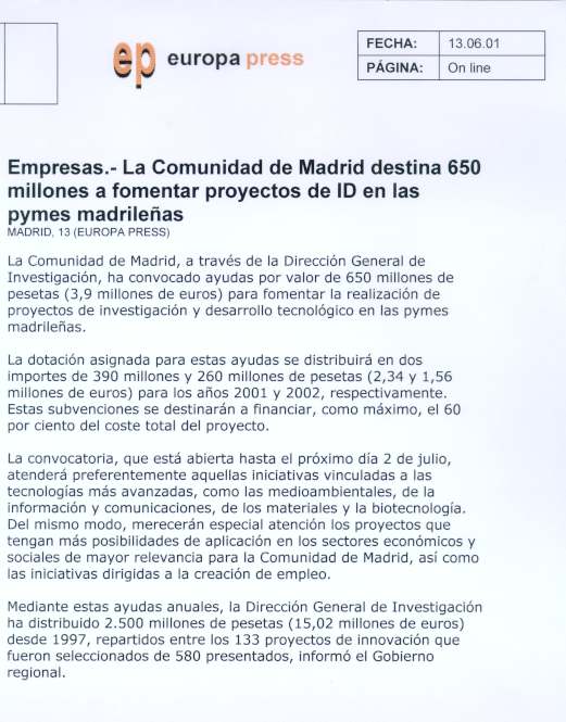 La Comunidad de Madrid, a través de la Dirección General de Investigación, ha convocado ayudas por valor de 650 millones de pesetas (3,9 millones de euros) para fomentar la realización de proyectos de investigación y desarrollo tecnológico en las pymes.