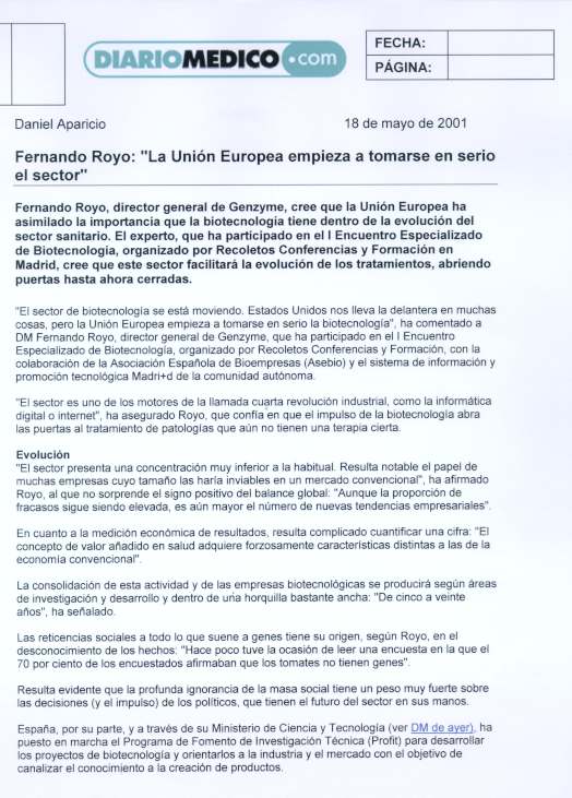 Fernando Royo, director general de Genzyme, cree que la Unión Europea ha asimilado la importancia que la biotecnología tiene dentro de la evolución del sector sanitario.