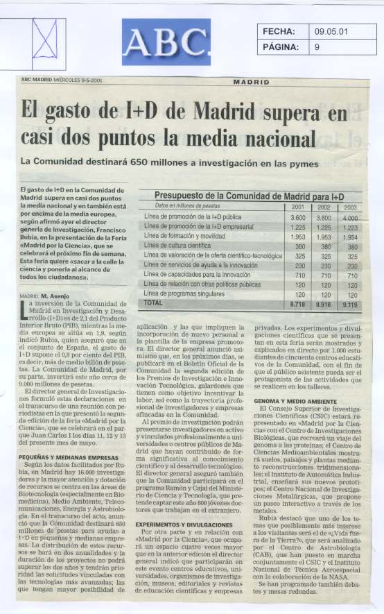 La inversión de la Comunidad de Madrid en Investigación y Desarrollo (I+D) es de 2,1 del Producto Interior Bruto (PIB).