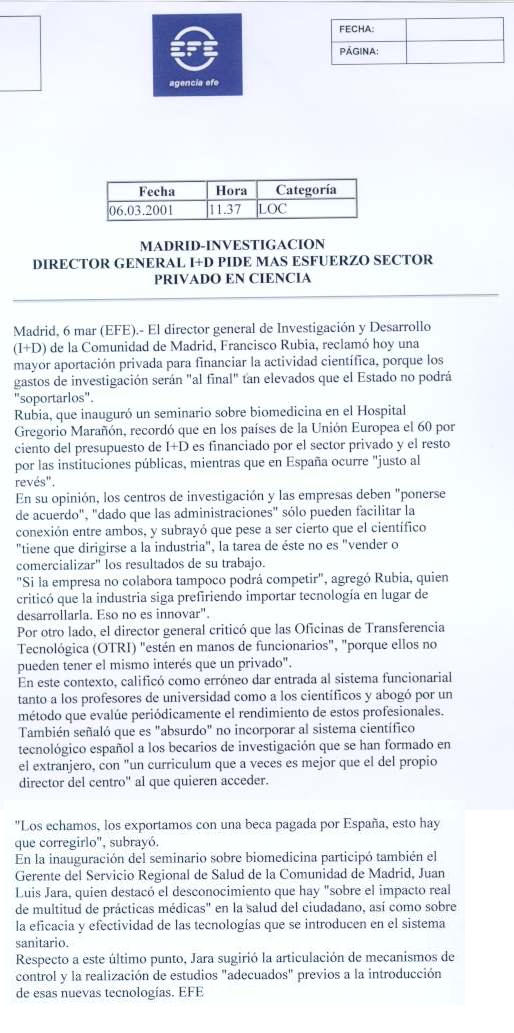 El director general de Investigación y Desarrollo (I+D) de la Comunidad de Madrid, Francisco Rubia, reclamó hoy una mayor aportación privada para financiar la actividad científica.