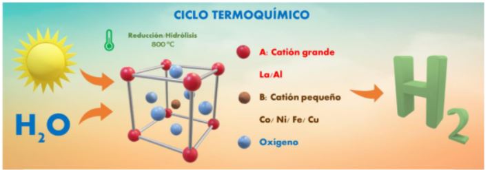 El hidrógeno limpio, también denominado hidrógeno verde, puede desempeñar un papel clave en la descarbonización de diversos sectores, tal y como pretende la Comisión Europea y la Agenda 2030 para el Desarrollo Sostenible. Este tipo de hidrógeno puede obtenerse mediante diversos procesos, como la electrólisis impulsada por la energía fotovoltaica, la gasificación de la biomasa, la fotosíntesis artificial o mediante los ciclos termoquímicos impulsados por energía solar térmica. En esta última alternativa, un material sólido es capaz de reducirse a alta temperatura liberando oxígeno- y reoxidarse al ponerse en contacto con vapor de agua, recuperando su estructura inicial y produciendo hidrógeno. Este proceso presenta la gran ventaja de obtener hidrógeno y oxígeno de forma separada, utilizando únicamente agua como materia prima sostenible. Sin embargo, su principal problema es que requiere condiciones muy exigentes de operación en cuanto a su temperatura (usualmente por encima de 1000-1200 C).