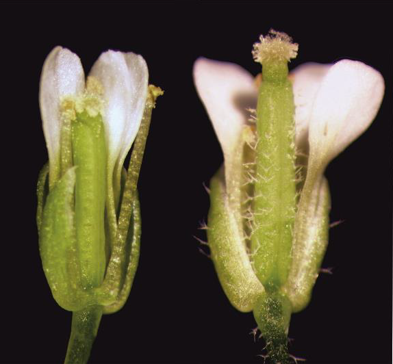 Flores de Arabidopsis donde se aprecia la diferencia de pelo, CNB-CSIC