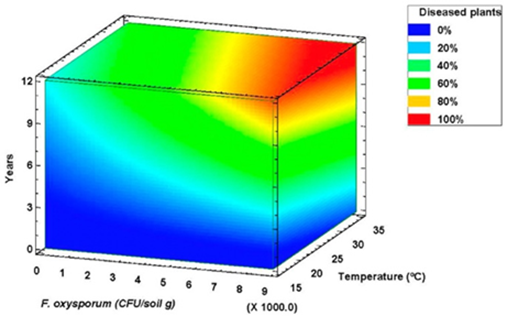 Gráfico de contorno que permite explorar la relación potencial entre la densidad del inóculo del hongo en el suelo, la temperatura media y la edad de la plantación con la gravedad de la enfermedad observada en campo. Autor: Daniel Palmero.