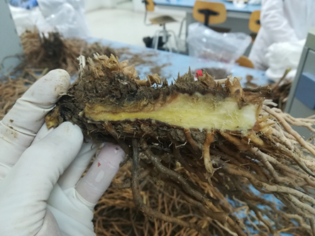 Detalle de la podredumbre del rizoma de una planta de espárrago afectada por fusariosis (autor: Laboratorio de Protección Vegetal, ETSIAAB).