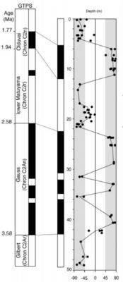 A la izquierda de la imagen está la escala temporal de los cambios de polaridad (negro es polaridad normal, blanco es polaridad inversa), en el centro la escala de polaridad del yacimiento interpretada y a la derecha los puntos de muestreo de paleomagnetismo.
