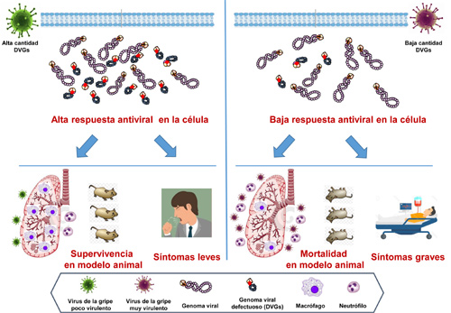Los virus de la gripe contienen material genético defectuoso que puede activar el sistema inmunológico en pacientes infectados, por lo que niveles más bajos de estas moléculas pueden aumentar la gravedad de la infección por este virus. Esta es la principal conclusión de una investigación desarrollada por investigadores del <a href="https://www.ciberes.org/" title="Centro de Investigación Biomédica en Red de Enfermedades Respiratorias" alt="Centro de Investigación Biomédica en Red de Enfermedades Respiratorias" target="_blank">Centro de Investigación Biomédica en Red de Enfermedades Respiratorias</a> (CIBERES) y del <a href="http://www.cnb.csic.es/index.php/es/" title="Centro Nacional de Biotecnología" alt="Centro Nacional de Biotecnología" target="_blank">Centro Nacional de Biotecnología</a> del CSIC (CNB-CSIC) en el laboratorio de la Dra. Amelia Nieto, liderada por la Dra. Ana Falcón, que acaba de publicarse en la revista <a href="https://journals.plos.org/plospathogens/article?id=10.1371/journal.ppat.1006650" title="PLOS Pathogens" alt="PLOS Pathogens" target="_blank">PLOS Pathogens</a>.