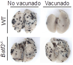 Imagen de pulmones con metástasis en ratones silvestres (WT) y deficientes en células dendríticas DC1 (Batf3-/-) que demuestra que las células dendríticas DC1 son necesarias para la eficiencia de la inmunoterapia del cáncer tras vacunación con antígenos tumorales.