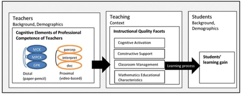 Figura 1. Modelo de las competencias del profesorado como construcción multidimensional y su influencia en el alumnado propuesto por Kaiser et al. (2016). En el modelaje se toma como ejemplo el conocimiento, enseñanza y aprendizaje en Matemáticas.