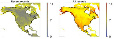 Los resultados del nuevo estudio muestran la cantidad pronosticada de especies de grandes mamíferos en América del Norte en el año 2070. A la izquierda el resultado de los modelos si solo se tienen en cuenta las observaciones actuales. A la derecha el resultado basándose en datos actuales e históricas.
