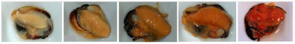 Para medir el color de los mejillones se utilizó una escala cualitativa de referencia con valores desde 1 (izquierda) hasta 5 (derecha). / Aquaculture 440 (pág. 35).