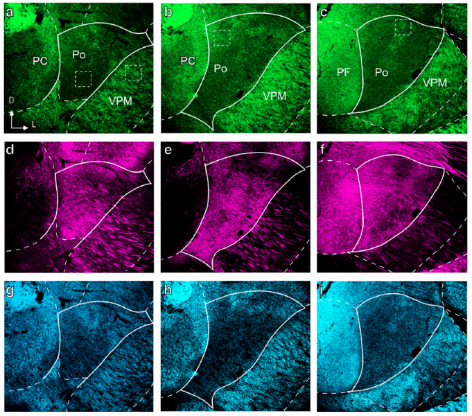Comparación en microscopia de fluorescencia confocal de la distribución en el núcleo posterior (Po) del tálamo de las terminaciones sinápticas procedentes del tronco del encéfalo y de la médula espinal (en verde) o de la corteza cerebral (en rojo) / Casas-Torremocha et al.