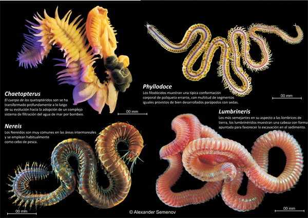 Imágenes en macro sintetizan el trabajo documental de dos investigadores estudiosos de la taxonomía y filogenia de los anélidos poliquetos (A. Nygren, G.W. Rouse) y de dos fotógrafos profesionales especializados en fauna marina (A. Semenov y J.A. Moya).