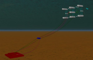 Simulación de la operación de un dispositivo Hive-TEC con su sistema de fondeo. / UPM.