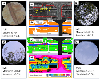 Situación de los puntos de toma de datos de la investigación, en modelo del software empleado ENVI-met. Abajo el área sin zonas verdes (b). Abajo situación con un escenario de zonas verdes en superficie y arboladas (c). En (d) simulación del factor de cielo visible de cada punto (Sky View Factor SVF). Fuente: Ester Higueras García et al. 2017.
