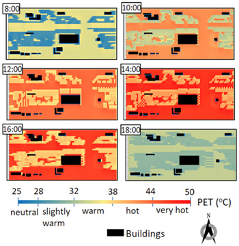 Evolución de la temperatura efectiva de confort desde las 8.00 horas a las 18,00 horas en los lugares registrados en la investigación, con escala de color, rojos mucho calor, y azules poco calor. Fuente: Ester Higueras García et al. 2017.
