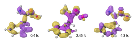 Variación de la densidad de carga con el tiempo para el confórmero más estable del aminoácido fenilalanina. El tiempo de expresa en femtosegundos (fs). El exceso (defecto) de carga respecto al valor promedio se representa en color amarillo (púrpura).