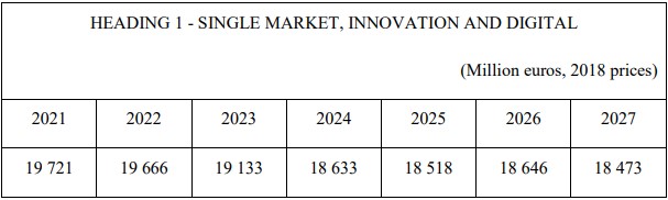 Estos programas tienen un valor decisivo para contribuir con las prioridades marcadas en lo que respeta a la promoción de la Investigación, la Innovación, la Transformación digital, las Inversiones Estratégicas Europeas, las acciones en favor del Mercado Único y para la competitividad de empresas y PYMEs, en las que también debe garantizarse la complementariedad con el desarrollo de su digitalización. En millones de Euros, los importes por año serán los siguientes: