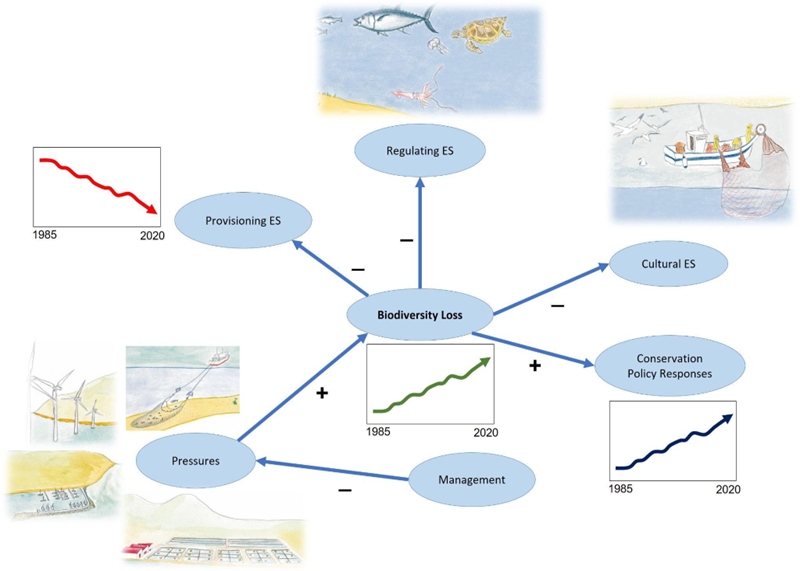 Modelo conceptual de las interacciones analizadas en el proyecto EME-Mar entre las presiones antropogénicas, la pérdida de biodiversidad, los servicios ecológicos marinos y las estrategias de conservación y gestión de las áreas marinas estudiadas. El análisis de los indicadores recopilados para 1985-2019muestra que las presiones antropogénicas aumentan la pérdida de biodiversidad marina y la prestación de servicios ecosistémicos (Provisioning, Regulating, Cultural). De hecho, la pérdida de biodiversidad impacta positivamente en las respuestas de las políticas de conservación a través de la promulgación de regulaciones (Management) y áreas marinas protegidas (Conservation Policy Responses) que no consiguen frenar la pérdida de biodiversidad. /P.Alcorlo.