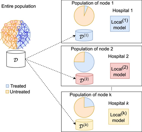 El estudio aborda el problema de la inferencia causal distribuida en hospitales, ya que los datos médicos con frecuencia están repartidos en distintos centros, con diferentes distribuciones de pacientes y con diversos criterios de asignación de tratamientos. Debido a las restricciones de privacidad, los datos personales de los pacientes no pueden ser compartidos entre hospitales, lo que complica la estimación precisa de los efectos de los tratamientos.