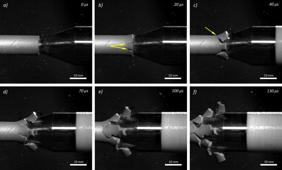 Secuencia de fotogramas extraídos de una grabación en cámara de alta velocidad del impacto del proyectil en el tubo realizado durante los experimentos./ UC3M.