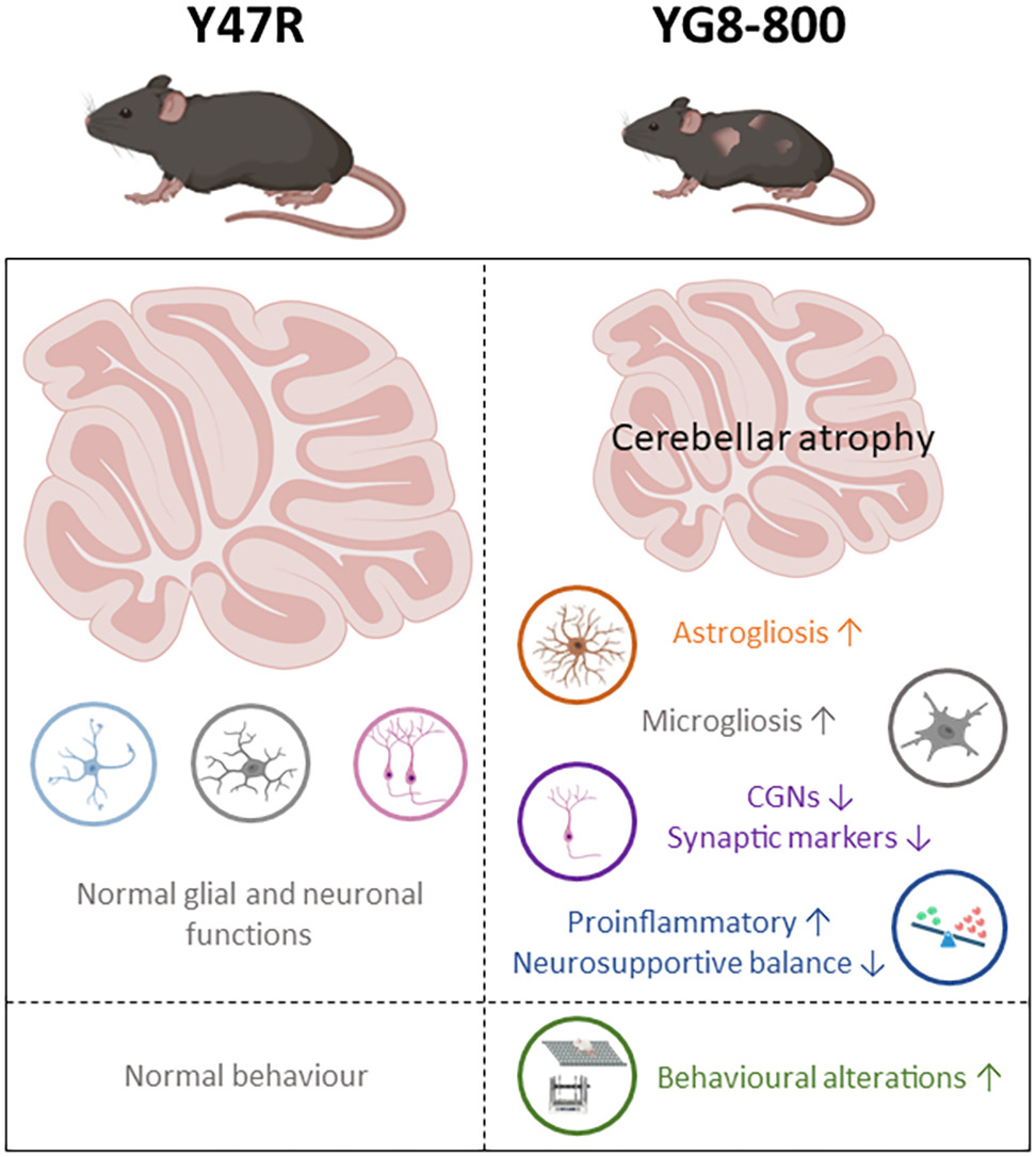 Estos hallazgos sugieren, en suma, que tanto la neuroinflamación como la reducción de factores neurotróficos podrían contribuir a la neurodegeneración en el cerebelo de los ratones YG8-800.