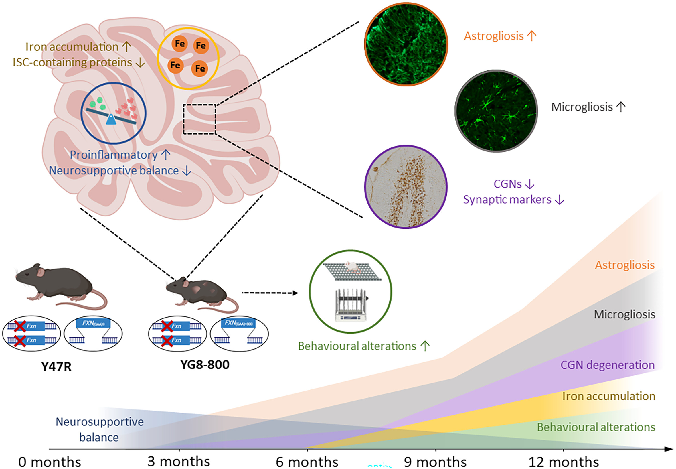 El análisis detallado de los ratones YG8-800 mostró a los científicos una atrofia progresiva del cerebelo, asociada a la degeneración de las neuronas granulares en la corteza cerebelosa. A nivel molecular, los bajos niveles de frataxina se correlacionan con niveles bajos de proteínas de la cadena transportadora de electrones mitocondrial y con una acumulación de hierro en el cerebelo.