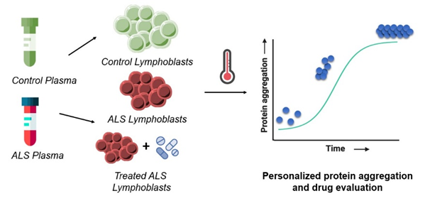 La presencia de agregados de proteínas fuera del núcleo celular es una alteración anómala, común en pacientes con ELA. Basándose en este hecho, el equipo ha analizado una colección de linfocitos —células inmunitarias obtenidas de la sangre— de un total de 15 pacientes, tanto de ELA esporádica como genética, así como de 3 personas sanas (controles). El equipo probó una variedad de fármacos contra la ELA sobre esta amplia colección de células, con el objetivo de reducir o prevenir la acumulación anómala de proteínas fuera del núcleo celular.