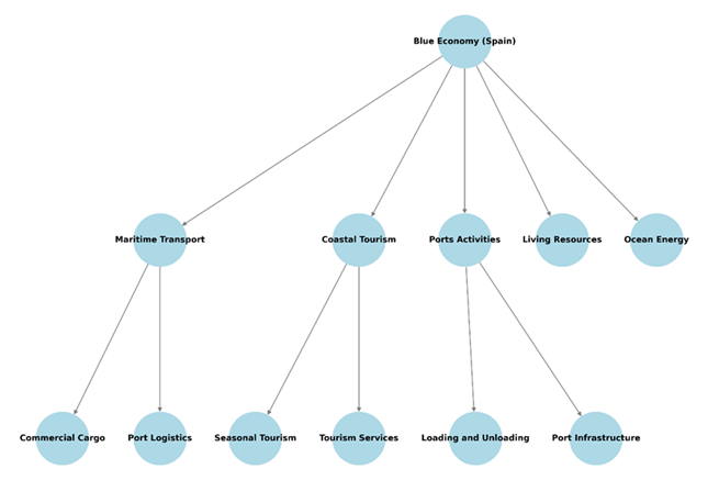 Jerarquía de los sectores de la Economía Azul en España. Fuente: Nicoletta González Cancelas, Javier Vaca-Cabrero, Alberto Camarero Orive. The Role of the Fishing Sector in the Blue Economy: Prioritization, Environmental Challenges, and Sustainable Strategies in Europe, with a Focus on Spain.