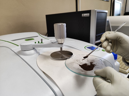 Inicio de ensayo con reflectancia total atenuada de una muestra de biocombustible previamente sometida a torrefacción. Fuente: UPM