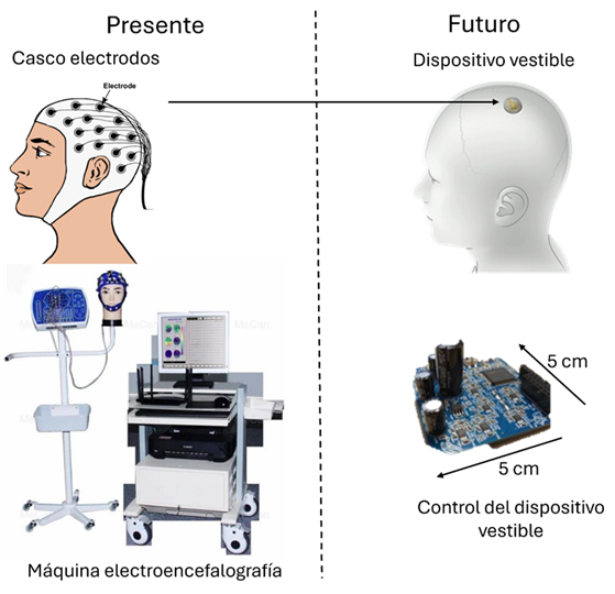 Presente: máquina de electroencefalografía con casco de electrodos en hospitales. Futuro: dispositivo vestible portable no invasivo colocado en la cabeza. Fuente: Ana Carretero Pérez.