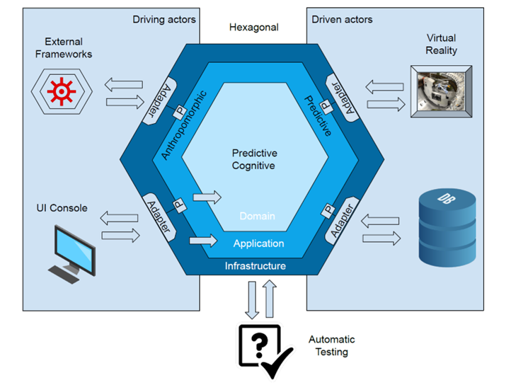 Generación e integración del modelo MAMIC. Enfoque antropomórfico (capa de aplicación): residen las interfaces de usuario y los componentes de interacción. Modelización predictiva (capa de aplicación y dominio): se encuentra la lógica empresarial y los componentes de procesamiento y análisis de datos. Arquitectura cognitiva (capa de dominio): se modelan y simulan los procesos cognitivos que se integran en la lógica empresarial para permitir un comportamiento similar al humano. Fuente Tamara Benito y Antonio Barrientos