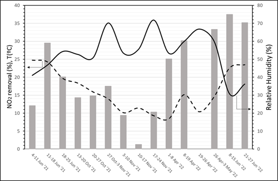 La figura anterior muestra los valores medios de eliminación de NO2 calculados como diferencia porcentual entre las concentraciones del aula con y sin pintura a lo largo del período de estudio. Se observó cómo los resultados fueron significativos en trece de las quince campañas evaluadas con porcentajes de reducción de NO2 entre el 9 y el 38 %, y con un valor medio global cercano al 20 %. Se pudo observar una dependencia estacional por la cual en períodos más cálidos y con mayor número de horas de luz (mayor radiación disponible) y menos húmedos se obtuvieron los mejores resultados. El agua, aunque necesaria, en elevada concentración puede interferir negativamente en el proceso.