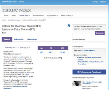 Los últimos informes del Nature Index, indicador que elabora anualmente la prestigiosa revista Nature, ubican al IFT (Instituto de Física Teórica UAM-CSIC) en los primeros lugares de excelencia investigadora. Su valoración competitiva en este indicador figura a la altura de reconocidos centros internacionales, como el Instituto de Estudios Avanzados de Princeton, o los grupos de Física Teórica del CERN y de la Universidad de Cambridge.
