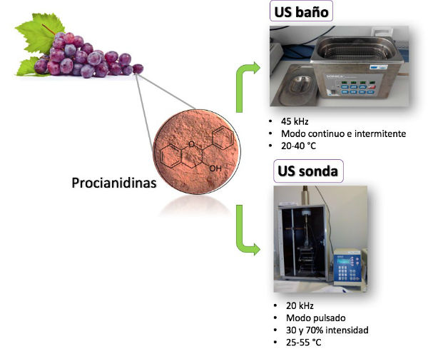 Teniendo en cuenta todo esto, y con el propósito de disponer de ingredientes alimentarios con funcionalidad mejorada revalorizando la materia prima de partida, un equipo del CSIC y la UAM se propuso investigar el efecto de una técnica emergente, los ultrasonidos de potencia (US), en la desagregación de procianidinas procedentes de subproductos de la industria vitivinícola, y en su capacidad antioxidante.