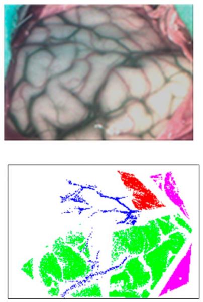 Imagen sintética del tejido cerebral (arriba) y clasificación de los tejidos (abajo); en verde tejido sano, en azul tejido vascular, en rojo tejido canceroso y en rosa dura madre. Fuente: UPM