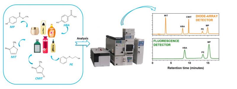 El grupo de Sensores y Especiación Metálica (GISEM) de la Universidad Autónoma de Madrid (UAM) ha desarrollado una metodología basada en la cromatografía líquida de alta eficacia (HPLC) con detección dual (conjunto de diodos, DAD + fluorescencia, FLD) para el análisis de conservantes de distintas familias químicas presentes en productos cosméticos.