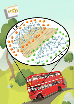Esquema de funcionamiento de un supercondensador fabricado con láminas de antimonene, simulando que forman parte del motor del típico autobús Londinense. Imagen creada por los autores del trabajo. /UAM