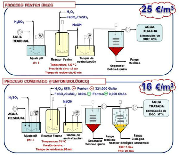 El empleo del proceso combinado (Fenton y biológico) permite reducir el coste por metro cúbico de agua tratada un 36% respecto al proceso Fenton utilizado actualmente en una industria farmacéutica. "El ahorro en el consumo de peróxido permite compensar el aumento de los costes de operación del tratamiento biológico y de los costes de gestión de los fangos", señala Fernando Martínez. La mayor producción de fangos del proceso combinado y, en consecuencia, de los costes de gestión asociados no suponen una contribución importante a los costes de operación (aproximadamente un 10 %). Además, los costes de operación del tratamiento biológico apenas alcanzan un 11%. Por tanto, la reducción de un 65% del consumo de peróxido de hidrógeno es un factor clave en la economía del proceso.