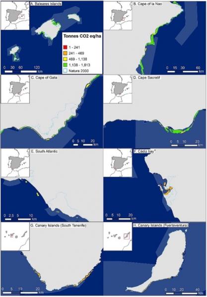 Los resultados se basan en el modelo de InVEST Blue Carbon y muestran una alta resolución espacial (100 m / píxel) de carbono almacenado en fanerógamas marinas. El trabajo constata la superficie protegida total en cada demarcación marina: Costa Atlántica Sur española (9%), Islas Canarias (41%), Mar de Alborán (7%) y Mar Mediterráneo Occidental (43%).