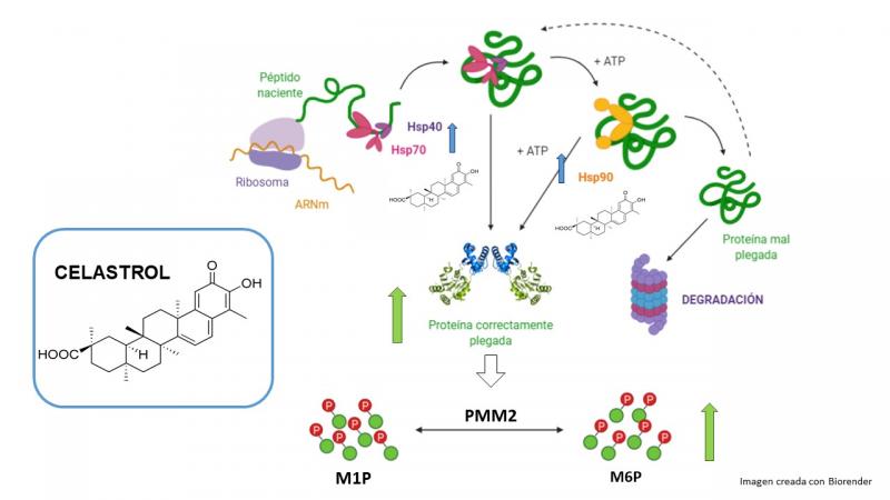 El celastrol es un regulador de la proteostasis que potencia el funcionamiento de la red de la proteostasis. El aumento en la expresión de las proteínas de choque térmico podría estar relacionado con el aumento en la cantidad de proteina PMM2 y en el incremento en su actividad enzimática / UAM