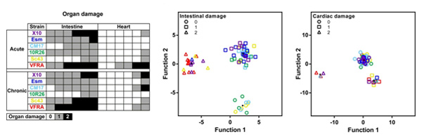 Daño en órganos de ratones infectados por distintas cepas (izquierda). Agrupación según los patrones patológicos comunes en intestino (centro) y corazón (derecha); y según el daño del órgano (0: sin daño; 1: daño moderado; 2: daño severo).