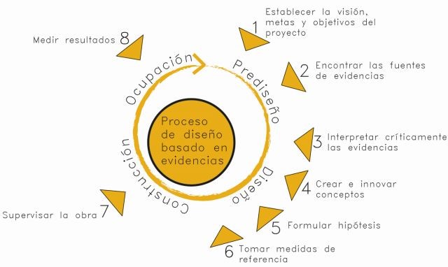 El proceso de diseño basado en evidencias. Esquema de Laura Cambra Rufino, contenido adaptado y traducido de “The EBD Process” de “The Centre for Health Design”.