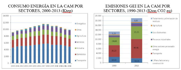 En el caso paradójico de la Comunidad de Madrid, pese a su carácter estratégico para el desarrollo socioeconómico regional, el sector energético se encuentra escasamente desarrollado al generar únicamente el 2% del consumo primario de energía (frente al 29% de media nacional), lo que obliga a importar prácticamente la totalidad de la energía necesaria para cubrir la demanda. En esta situación, entre los años 2000 y 2013 el sector transporte registró la mayor cuota de consumo energético regional (49,6%) fundamentalmente basado en productos petrolíferos (96,6%), encontrándose infrarrepresentados los combustibles alternativos (electricidad, gas natural y biocarburantes).