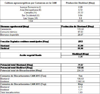 Según una estimación sobre la cantidad de biocarburantes no convencionales potencialmente generados en la Comunidad de Madrid a partir de cultivos energéticos (Cynara cardunculus para la producción de biodiesel) y material residual, se podría alcanzar una producción teórica de 204,3 ktep (de los que 71,7 ktep corresponderían a bioetanol y 132,6 ktep a biodiesel), cantidades en ambos casos superiores a los respectivos consumos registrados.