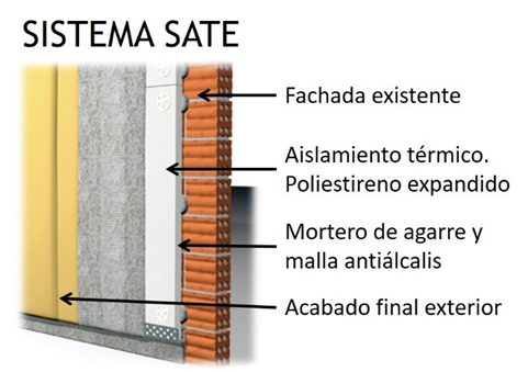 SATE. Esta medida incrementa la resistencia térmica de la envolvente, en la que la fachada juega un papel principal, y combina la mejora estética y funcional de los edificios. Este método, además de resolver problemas técnicos como puentes térmicos o condensaciones en las viviendas, no reduce el espacio en su interior y es poco o nada invasivo en su colocación. Varios estudios de simulación estiman que el ahorro energético de una vivienda aislada por el exterior, en climas como Madrid, supone hasta un 18% de mejora.