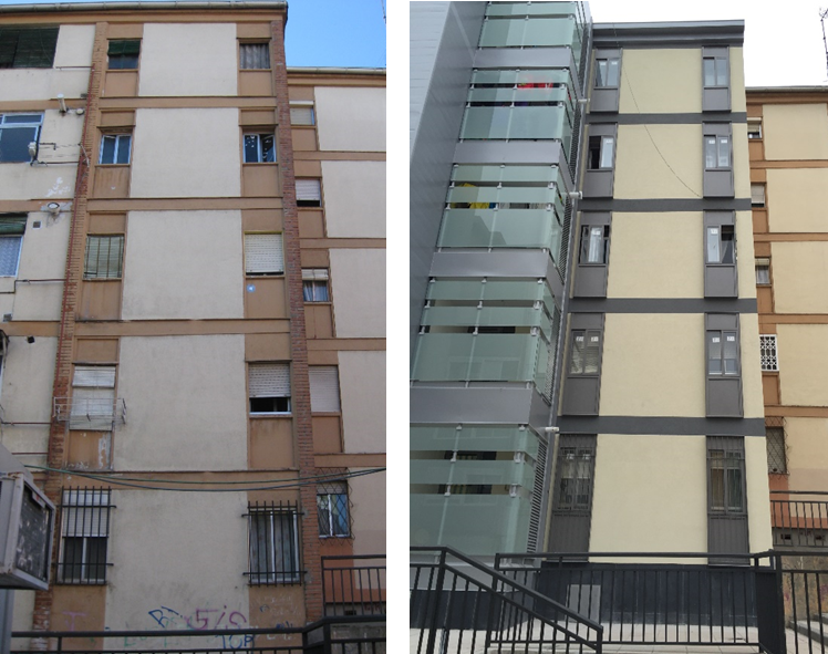 Edificio de viviendas rehabilitado. Fachada principal norte. Original (izquierda) Rehabilitado (derecha). Autor: Sheila Varela Luján.