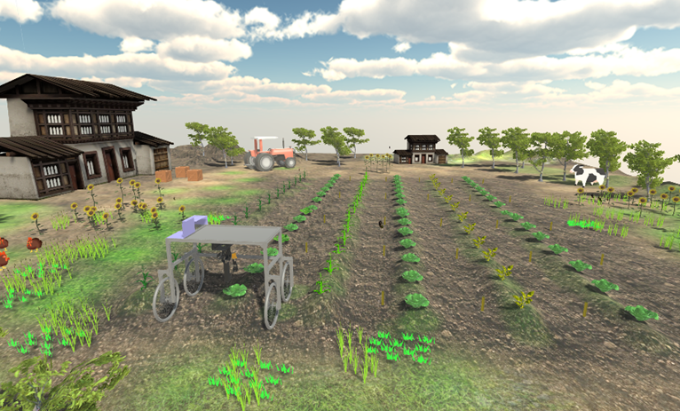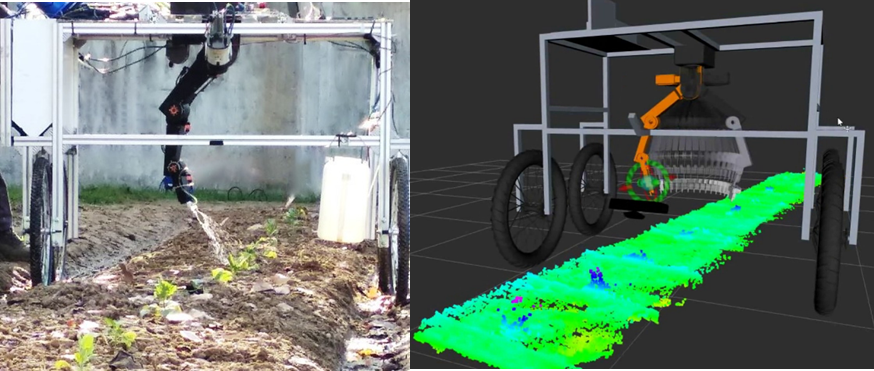 En una primera fase, el equipo de investigación implementó un simulador altamente realista del campo de cultivo, recreando hileras de vegetales (repollos, alubias, habas), así como la gestión del sistema de comunicaciones con la plataforma robótica. Esto permitió evaluar los algoritmos de sistemas sensoriales, los movimientos del brazo robótico evitando el daño a las plantas y la arquitectura de control y comunicación utilizada bajo ROS (Robot Operating System).